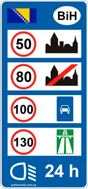 Стандартні обмеження швидкості в Боснії і Герцоговині (якщо інше не вказано на знаках).