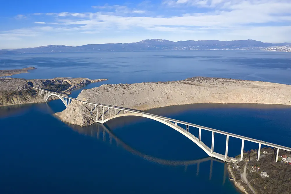 Міст Крк з'єднує острів Крк з материком. Міст Крк має протяжність 1,43 км і висоту 67 м.