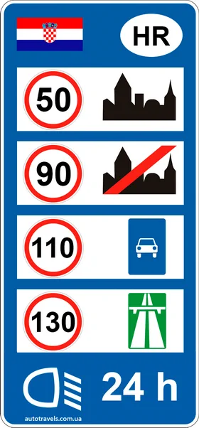 Стандартні обмеження швидкості в Хорватії (якщо інше не вказано на знаках).