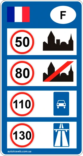 Стандартні обмеження швидкості у Франції (якщо інше не вказано на знаках).