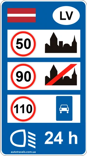 Стандартні обмеження швидкості у Латвії (якщо інше не вказано на знаках).