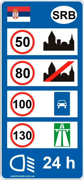 Стандартні обмеження швидкості в Сербії (якщо інше не вказано на знаках).