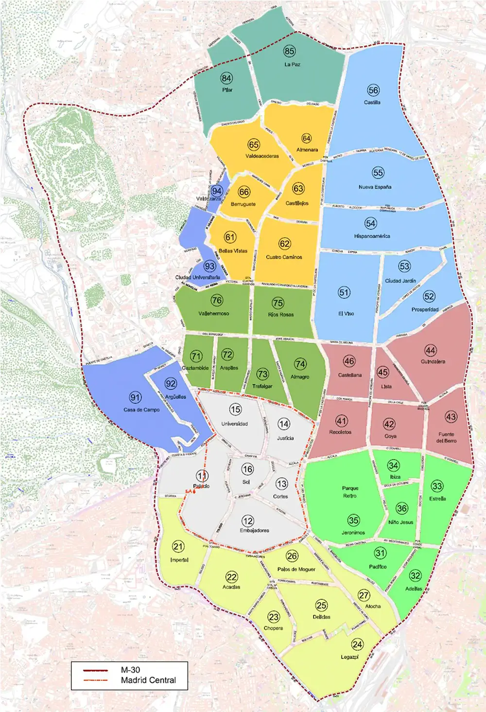 Існують різні зони для стоянки. З різними обмеженнями за часом можливої стоянки, цінами, особливостями. Але ми рекомендуємо залишати автомобіль за межами зони платної стоянки і далі рухатись громадським транспортом, він працює чудово в Мадриді, гілки метро і електричок розгалужені, весь транспорт їздить з маленькими інтервалами. Для прикладу добирання до аеропорту займе близько 40 хвилин з центру міста. Якщо ви всеж вимушені їхати в центральну частину міста на автомобілі, то нижче інформацію про зони стоянки і тарифи в них.