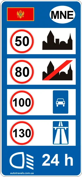 Standard speed limits in Montenegro (unless otherwise indicated on signs).