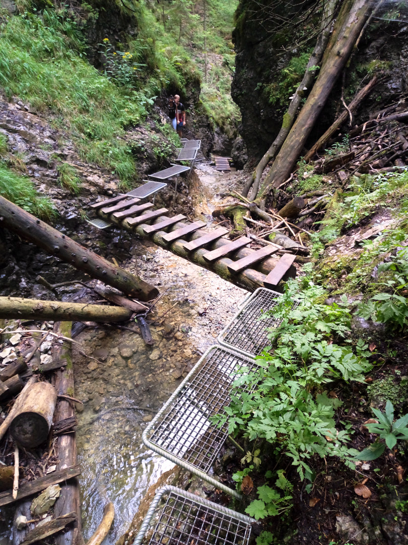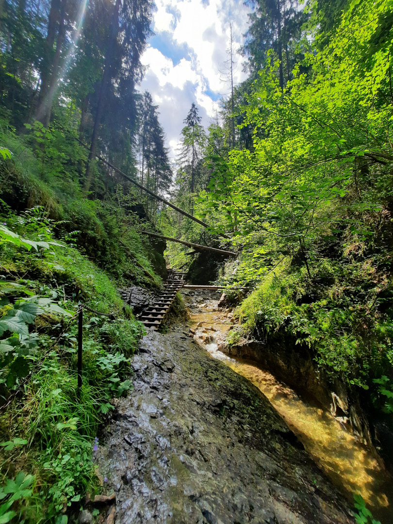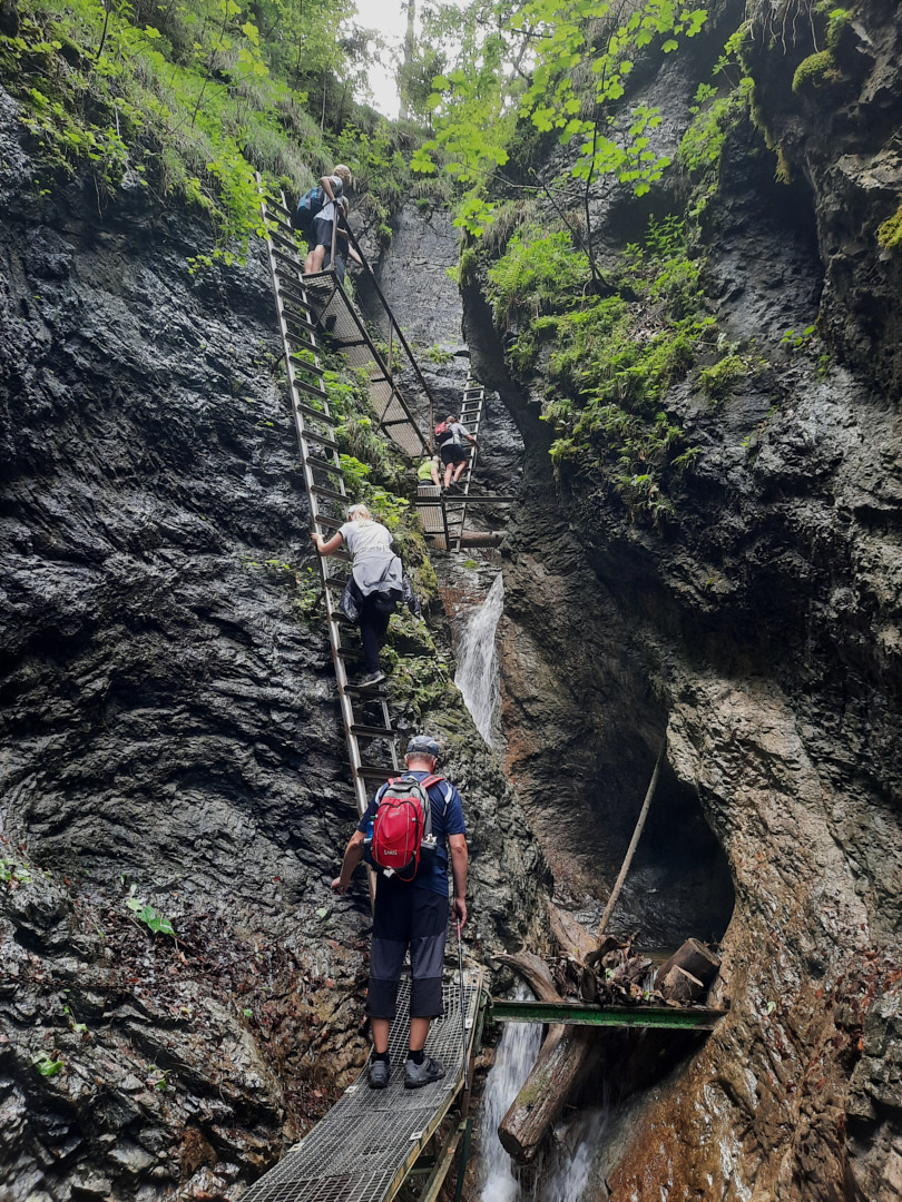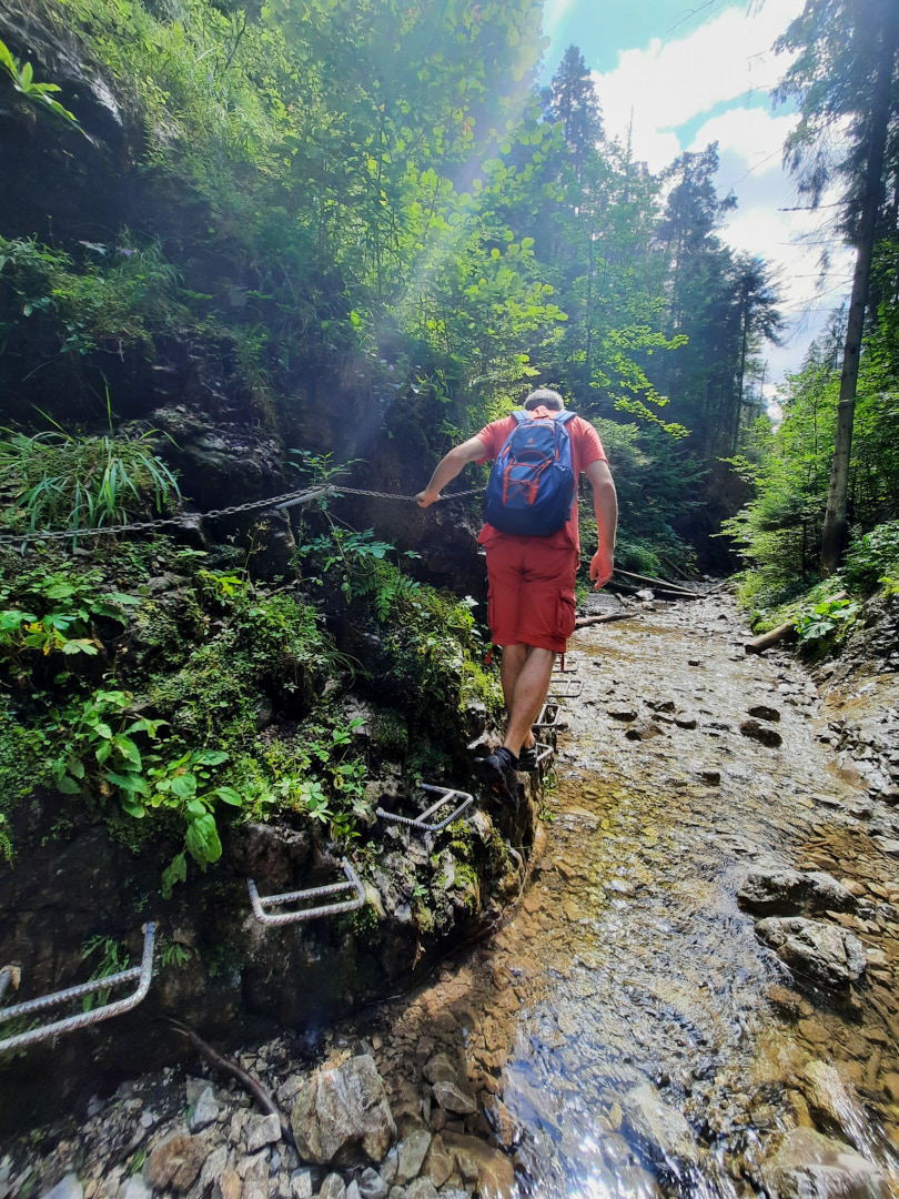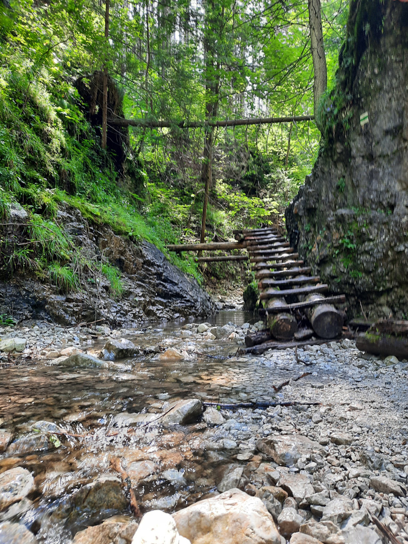 One of the most popular routes through the Suchá Belá gorge starts from here. While walking the route, we saw people of all ages, including children and older generations. So, if you've been hiking lately, traversing the gorge shouldn't be a problem. The only nuance is that there are ladders going up near the waterfalls—simple ladders, often without handrails and, moreover, without protection against falls, etc. So, if you have a fear of heights or find a ladder of 10-20 meters (higher than the 3rd floor of a building) challenging, it's better to choose another route. The gorge is traversed by a river, and to avoid walking in the water, metal footbridges are embedded in the rocks, used by tourists. You're unlikely to find as many waterfalls and beautiful spots at once elsewhere, so we highly recommend this route.