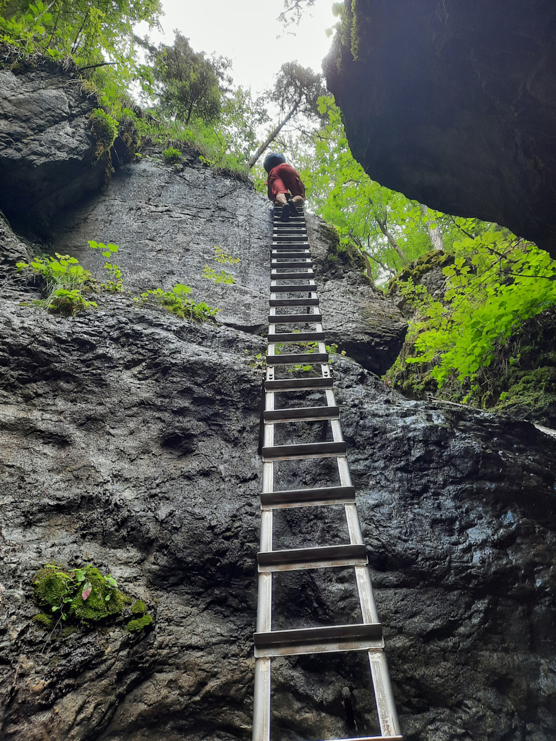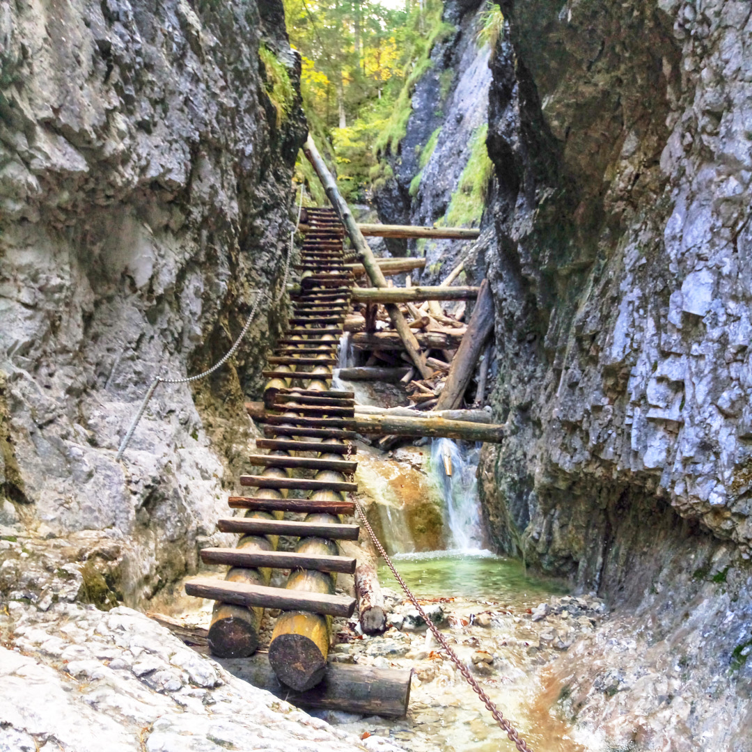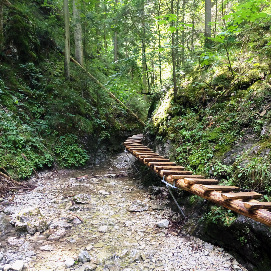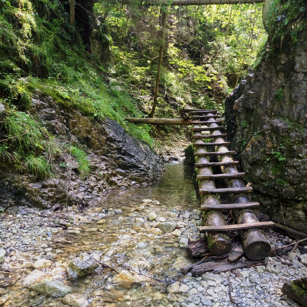 One of the most popular routes through the Suchá Belá gorge starts from here. While walking the route, we saw people of all ages, including children and older generations. So, if you've been hiking lately, traversing the gorge shouldn't be a problem. The only nuance is that there are ladders going up near the waterfalls—simple ladders, often without handrails and, moreover, without protection against falls, etc. So, if you have a fear of heights or find a ladder of 10-20 meters (higher than the 3rd floor of a building) challenging, it's better to choose another route. The gorge is traversed by a river, and to avoid walking in the water, metal footbridges are embedded in the rocks, used by tourists. You're unlikely to find as many waterfalls and beautiful spots at once elsewhere, so we highly recommend this route.