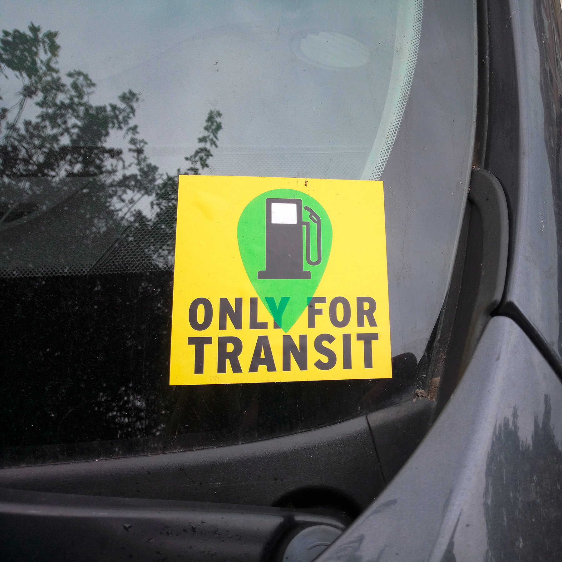 На автомобіль вам можуть приклеїти наклейку, таку як зображено на фото нижче. Якщо вам потрібно знайти заправку де можна зупинитись, то перед кожною заправкою стоять знаки, перший за 2 км до заправки, потім за 1 км до заправки, потім за 500 м до заправки, і на всіх них немає жодних відміток, чи призначена ця заправка для транзитих зупинок. І тільки вже на знаку з'їзду на заправку буде жовтий значок транзиту, такий як на наклейці авто. На такі заправки можна з'їжджати.